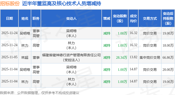 招标股份近半年内的董监高及核心技术人员增减持详情如下: