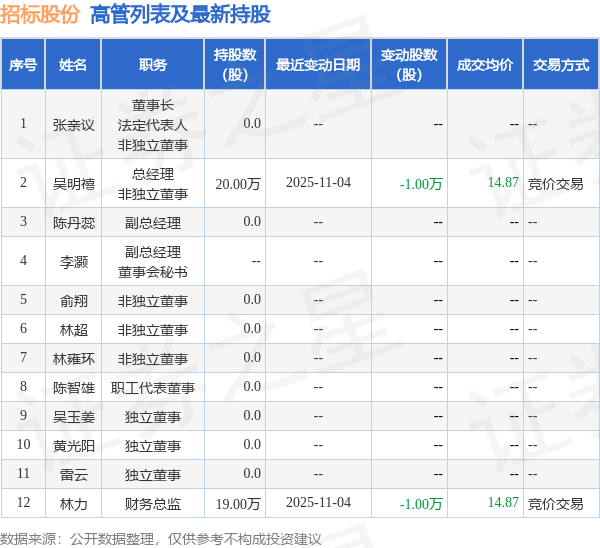 招标股份的高管列表及最新持股情况如下: